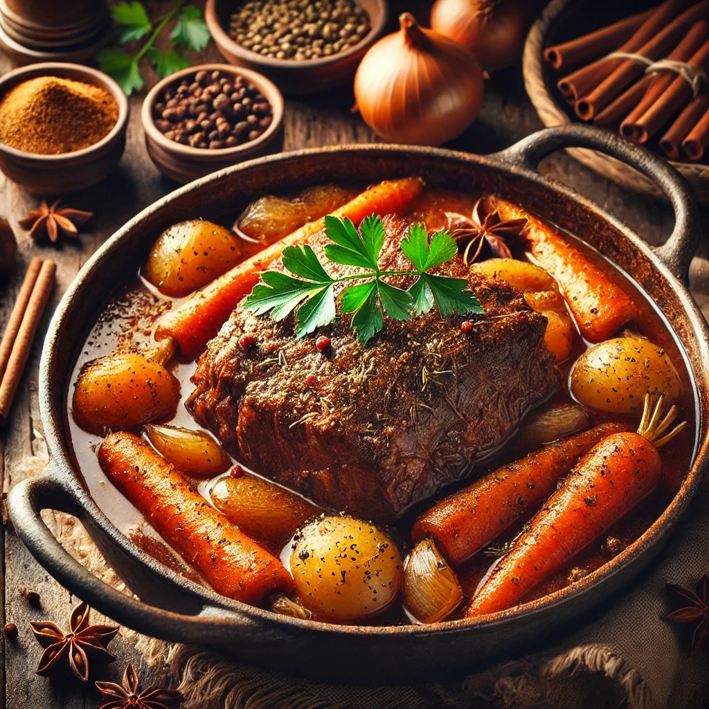 This pot roast has a rich, savory flavor with subtle warmth from the Middle Eastern spices, perfect for a cozy meal. Enjoy!